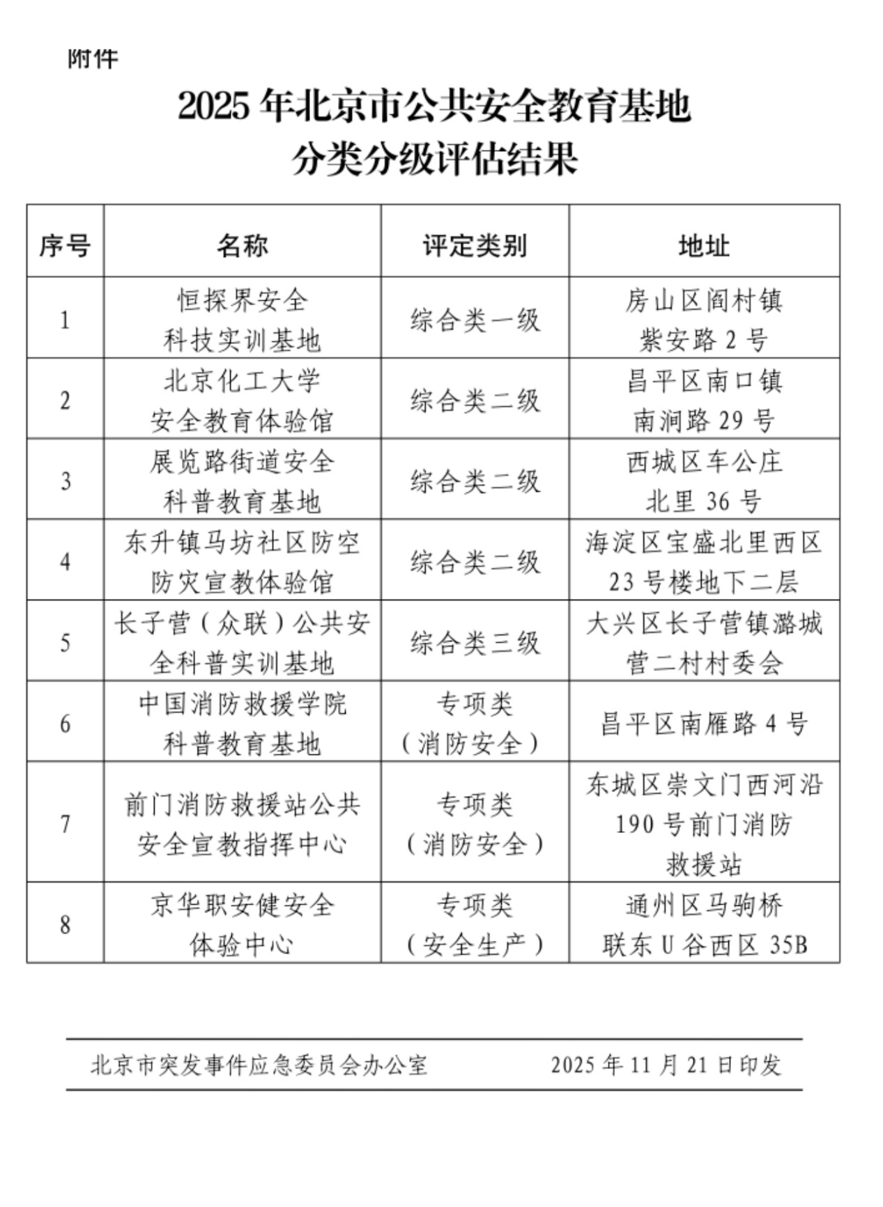 为系统推进全市公共安全教育基地的规范化建设与高质量发展,2025年4月,北京市突发事件应急委员会办公室联合北京市安全生产委员会办公室共同印发了《关于开展2025年北京市公共安全教育基地分类分级评估等相关工作的通知》(京应急办通[2025]14号),正式启动了本年度基地的分类分级评估工作。