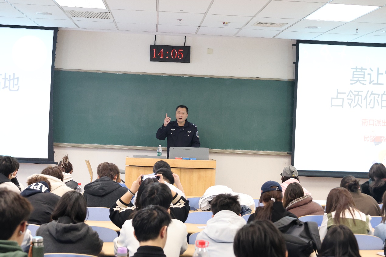 下午14时,讲座准时开始。公安昌平分局反诈中心民警结合近期高校高发的电信网络诈骗案例,用通俗易懂的语言、生动鲜活的视频资料,详细剖析了“刷单返利”“冒充客服”“网络游戏虚假交易”“校园贷”等多种常见诈骗手段的作案手法和防范要点。
